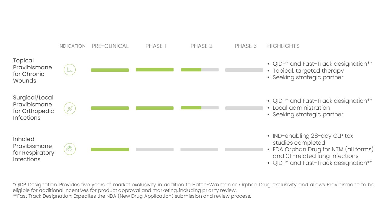 Pravibismane has been granted Qualified Infectious Disease Product (QIDP) and Fast Track designations by the US FDA for: (1) adjunctive treatment of moderate and severe diabetic foot ulcer infection, and (2) treatment of post-surgical orthopedic implant infections. QIDP designation provides five years of additional market exclusivity beyond Hatch-Waxman exclusivity and makes pravibismane eligible for further incentives, including priority review. Fast Track designation may expedite the New Drug Application (NDA) submission and review process. Pravibismane has also received Orphan Drug designations for the management of cystic fibrosis-related lung infections and for nontuberculous mycobacterial infections, including all infection locations such as the lung and soft tissue.